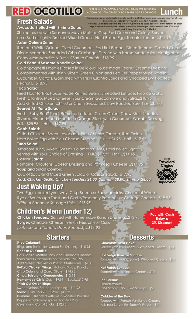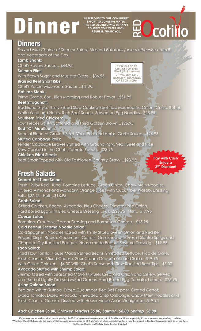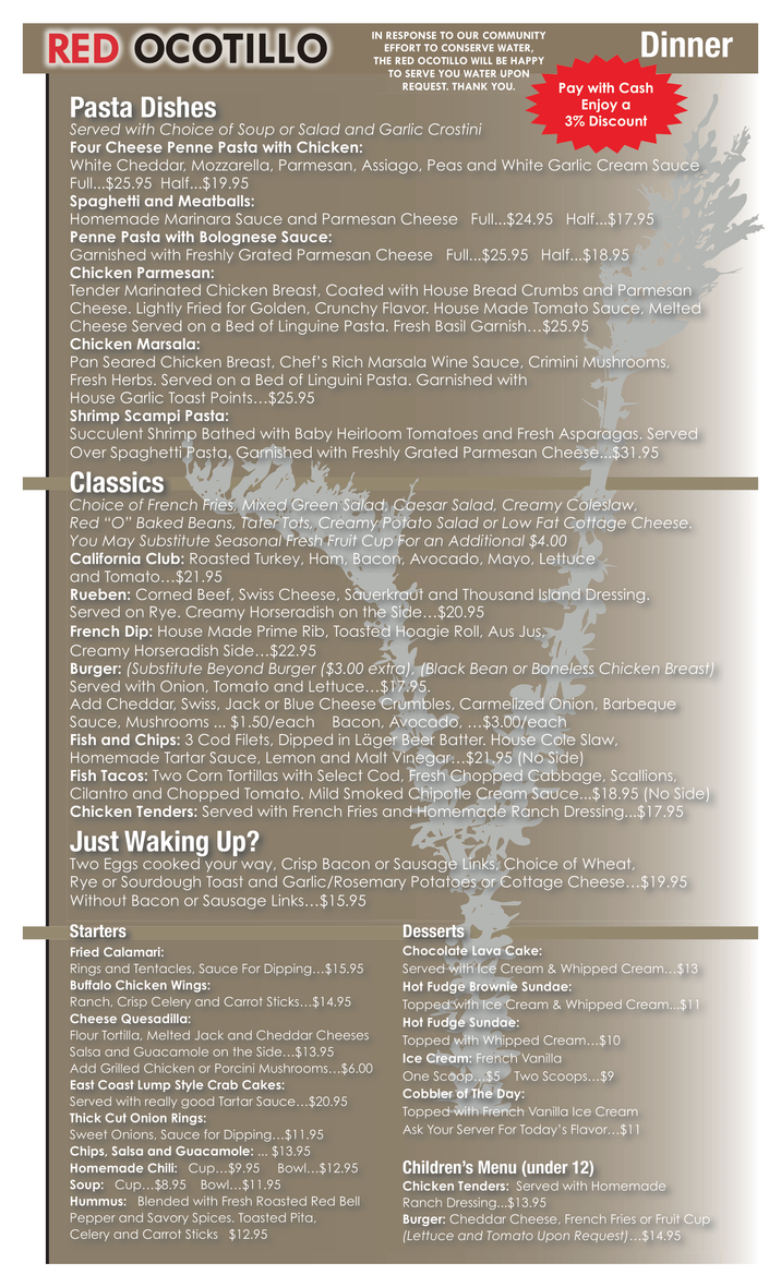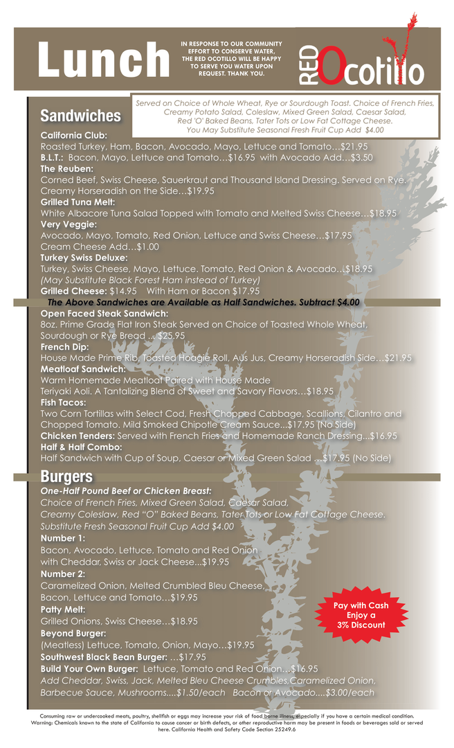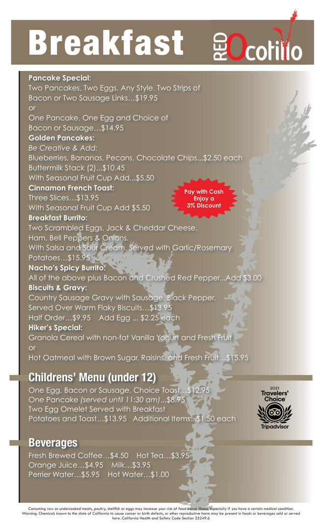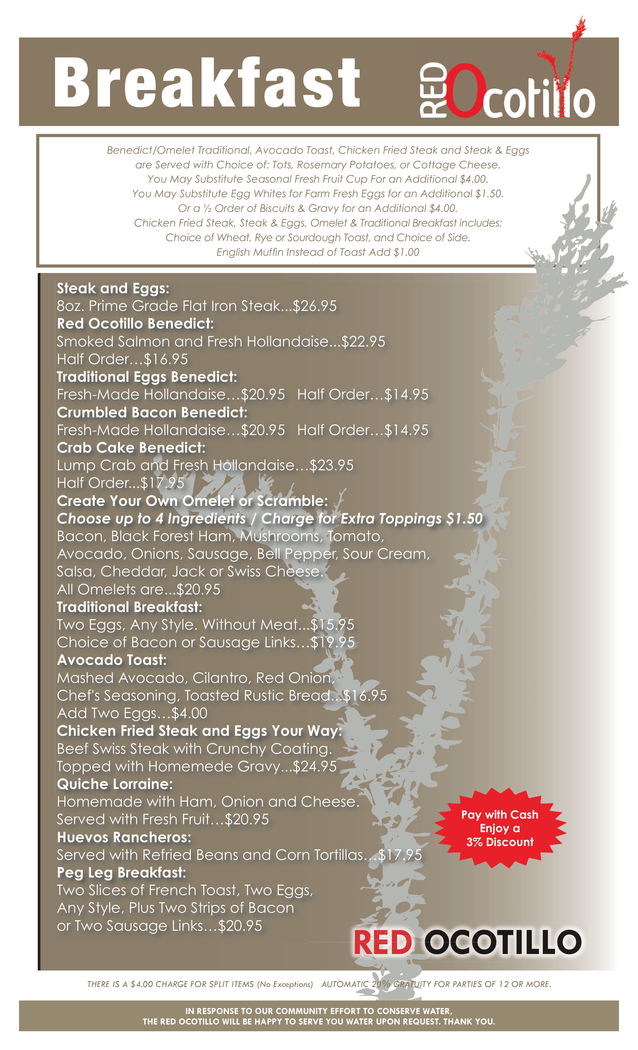 The Red Ocotillo serves hearty, satisfying American fare made with fresh ingredients and local care. Enjoy breakfast, lunch, or dinner in a relaxed setting—indoors or on our shaded patios. From signature benedicts and burgers to crisp salads, pastas, and desserts, there’s something for every appetite.